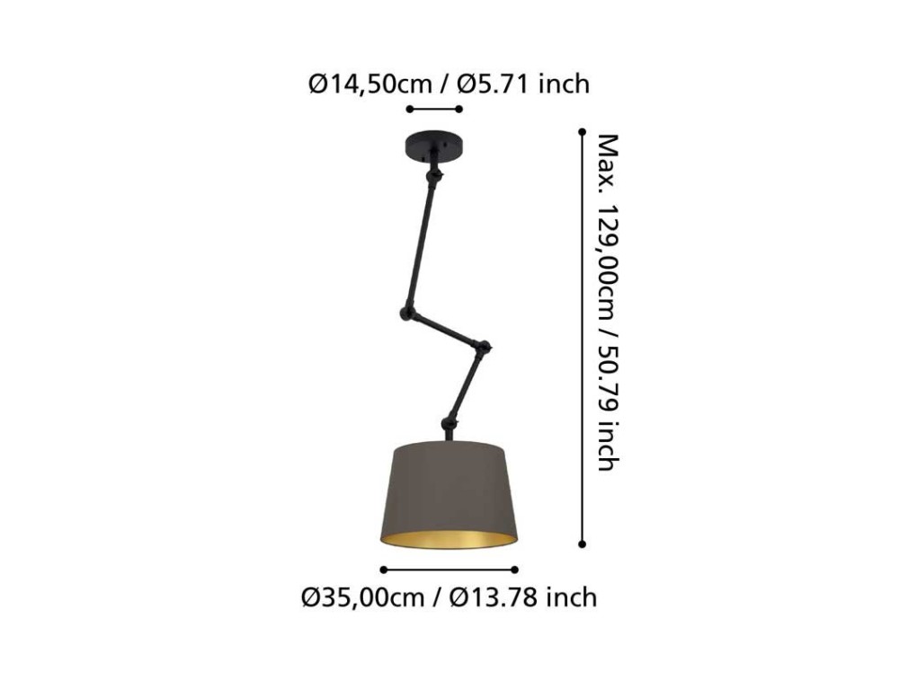 Die Deckenleuchte PISTUNIO besteht aus schwarzem Metall und Stoff, in der gleichen Farbe oder in der Cappuccino-Farbvariante mit Messinginnenseite. Der lange Arm mit vier beweglichen Gelenken ermöglicht die Einstellung der Höhe und Position des Lampenschirms.