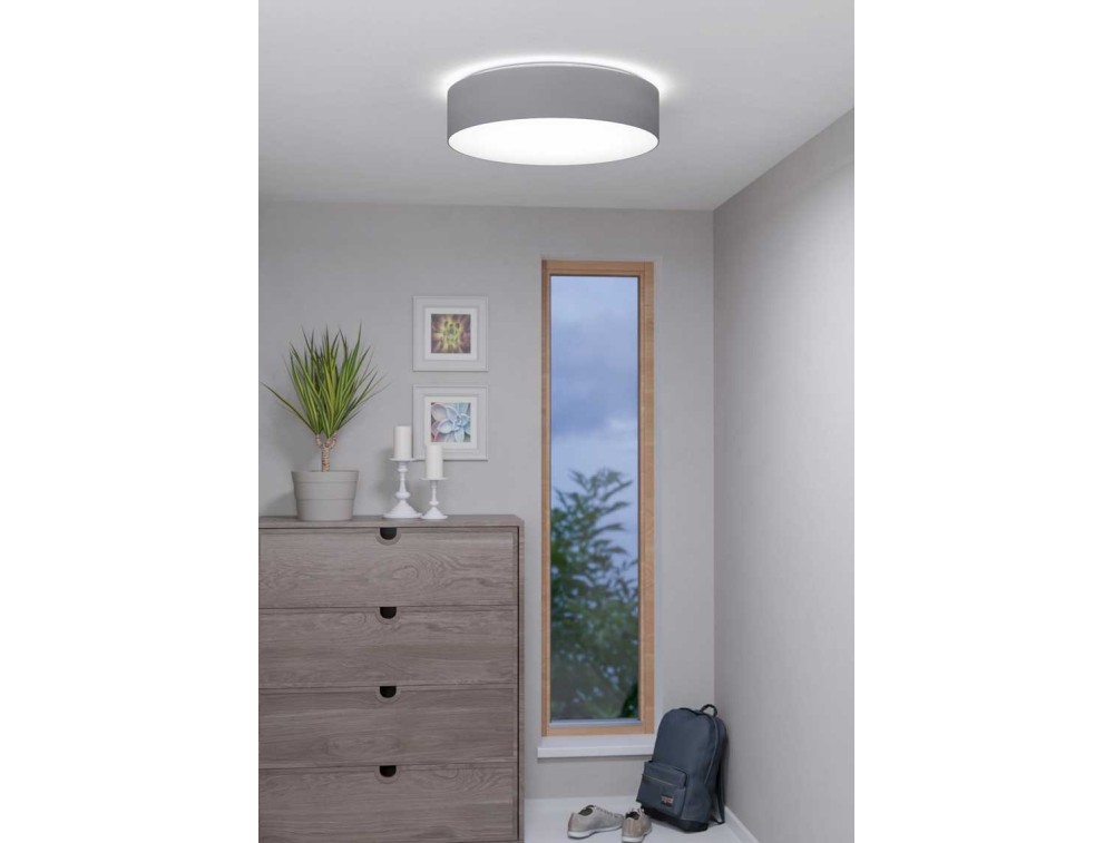 Deckenleuchte aus weißem, grauem oder taubengrauem Stoff mit weißem Polycarbonat-Diffusor, aus dem das LED-Licht austritt. Integrierte farbwechselnde LED, Steuerung per App, dimmbar, Smart Home, Fernbedienung.