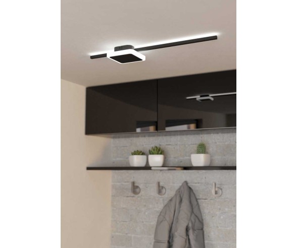 Die LED-Deckenleuchte SARGINTO besteht aus einem weißen LED-Metallprofil und einem runden Metallelement. Das weiße Metallelement ist zudem von einer hellen Kunststoffoberfläche umgeben.