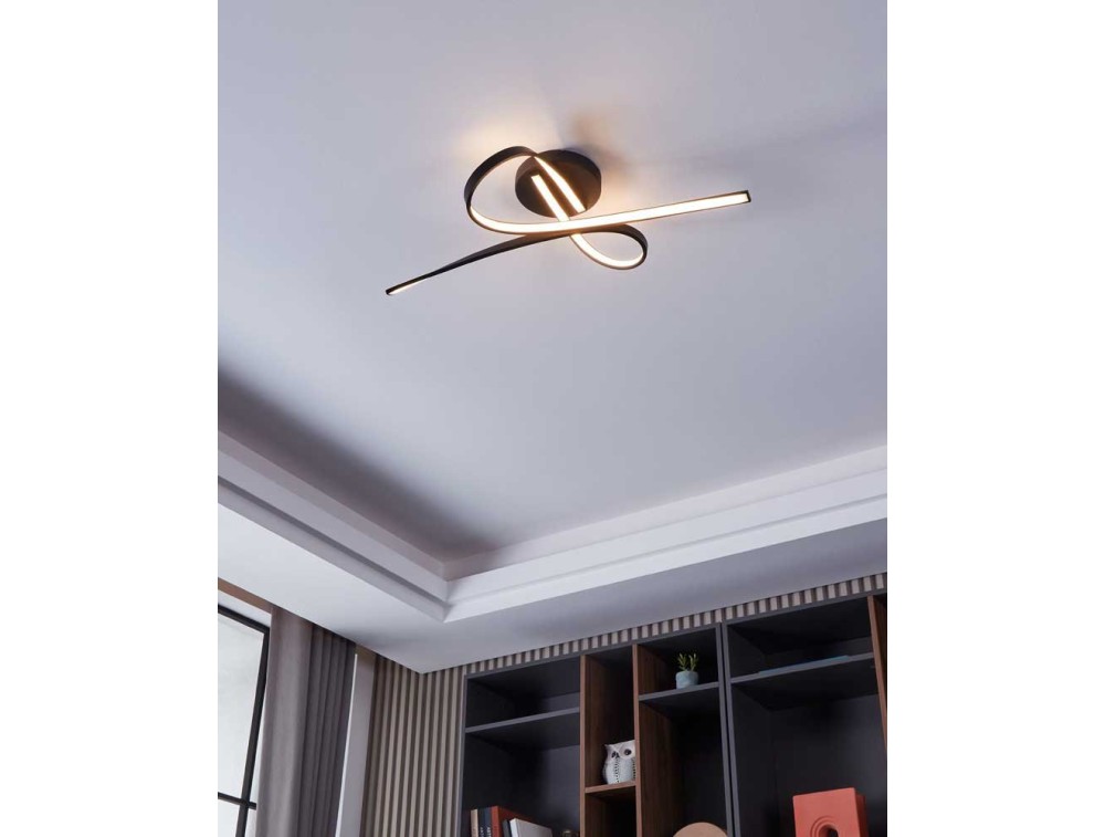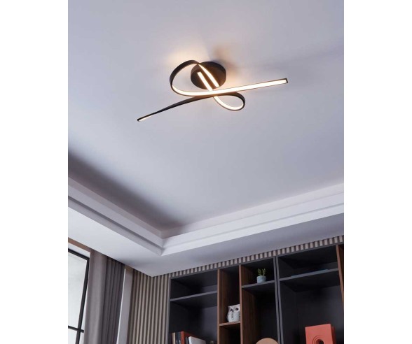 Die LED-Deckenleuchte SELVINA ist aus schwarzem Aluminium gefertigt und besteht aus einem Sockel und zwei leicht gebogenen LED-Profilen. Die integrierte LED strahlt warmweißes Licht aus.