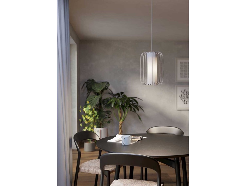 Kronleuchter für Küche oder Wohnzimmer, mit sandfarbener Stahlstruktur und einem weißen Stoff im Inneren, der die Glühbirne tarnt.