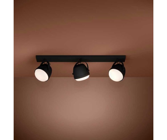 Die Deckenleuchte UPANEMA besteht aus schwarzem Metall mit drei beweglichen Strahlern, die jeweils mit einem Zierbogen ausgestattet sind. Deckenleuchten aus satiniertem Glas sind im Lieferumfang enthalten und können optional montiert werden, um der Lampe eine zusätzliche Note zu verleihen.