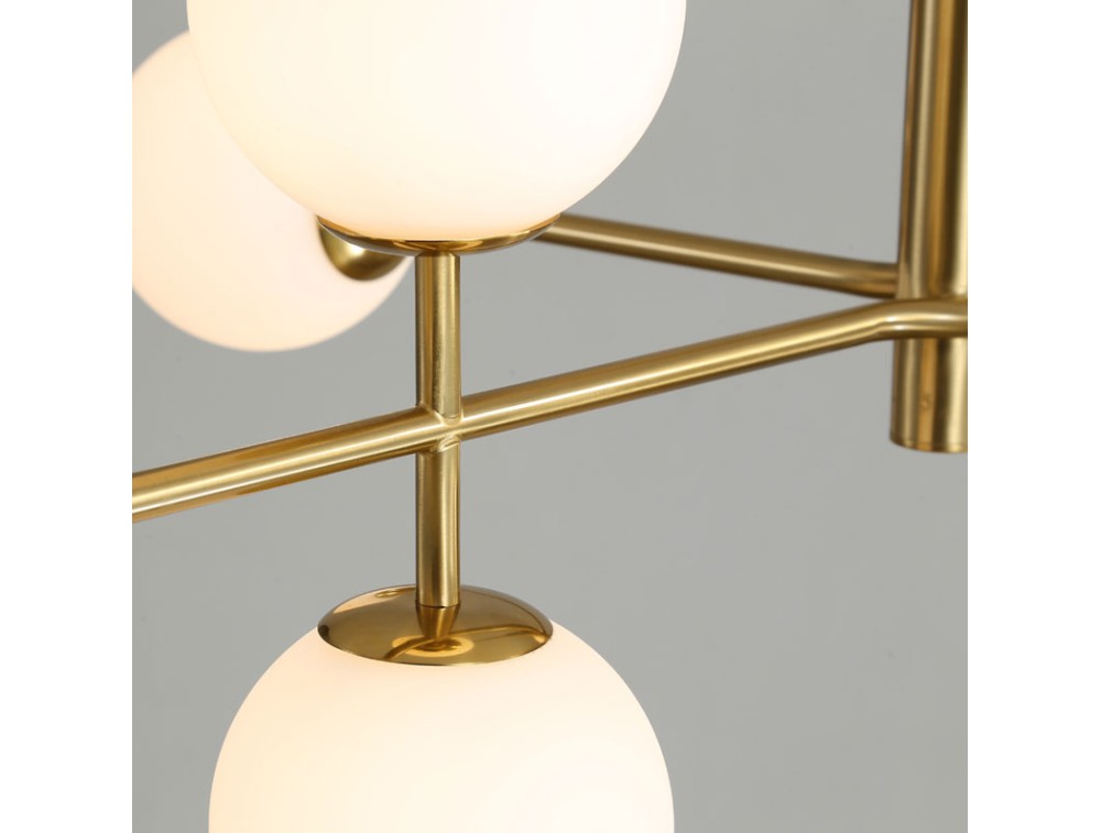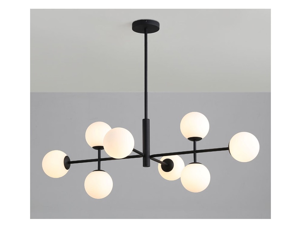 8-flammige Pendelleuchte mit Eisengestell und Glasdiffusoren. Ideal zur Beleuchtung und Dekoration von Küche, Wohnzimmer und Schlafzimmer. Erhältlich in Schwarz und Gold für einen schlichten und eleganten Look. Dank ihrer horizontalen Ausdehnung eignet sie sich hervorragend zur Beleuchtung rechteckiger Esstische oder großer Kücheninseln, da sie sich über die gesamte Tischplattenlänge erstreckt.