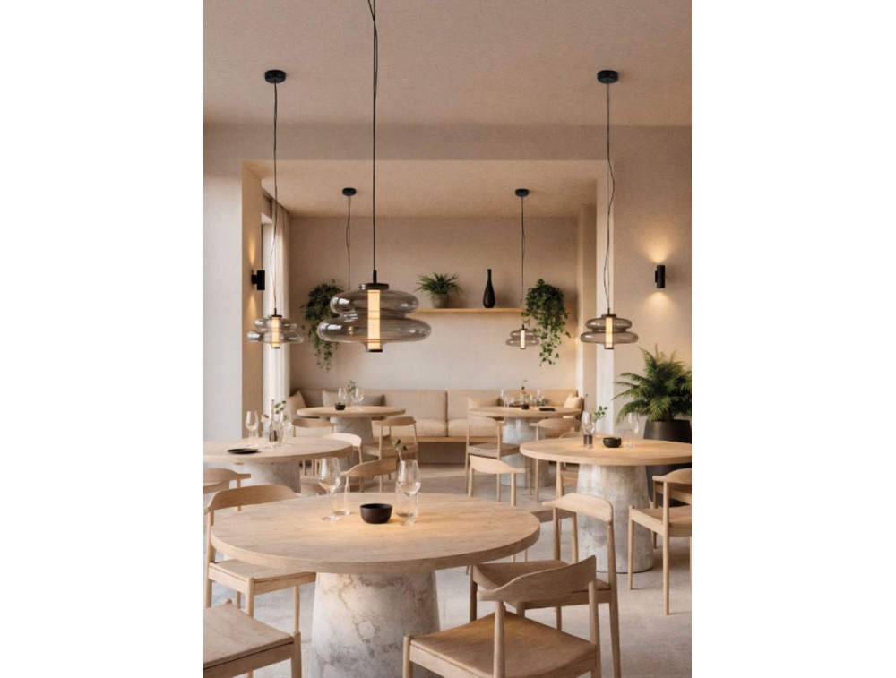 Pendelleuchte aus Aluminium mit Diffusor in verschiedenen Farben, darunter Bernstein und Rauchgrau. Integrierte 2700K-LED und Schutzart IP20. Ideal zur Beleuchtung und Dekoration von Küchen, Wohn- und Schlafzimmern. Perfekt, um durch die Kombination von Farben und Größen einen einzigartigen und individuellen Raum zu schaffen. Die Leuchte erzeugt einen skulpturalen visuellen Effekt, selbst wenn sie ausgeschaltet ist.