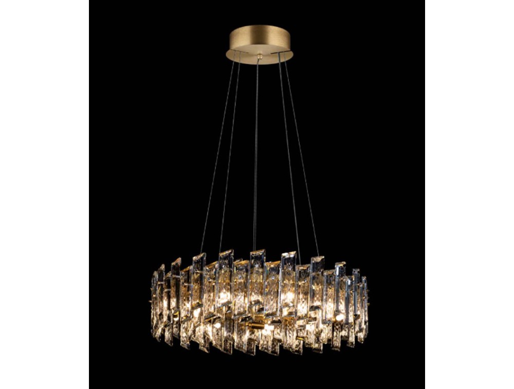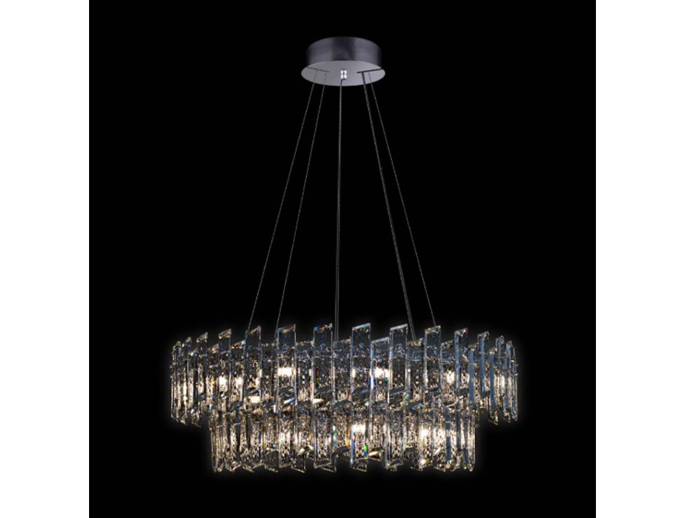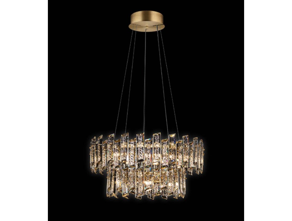 Pendelleuchte mit prächtigen K9-Kristallen und einem polierten Metallrahmen aus Gold und Chrom. Ideal zur Dekoration und Beleuchtung von Küche, Wohnzimmer, Flur und Schlafzimmer. Die Faszination der K9-Kristalle wird durch ein strukturiertes Mittelstück mit beeindruckender Größe und atemberaubender Schönheit zusätzlich hervorgehoben. Die Leuchte strahlt Luxus und Exklusivität aus. Ein üppiger, zweistufiger Lichtkaskadeneffekt mit verstellbarer Höhe.