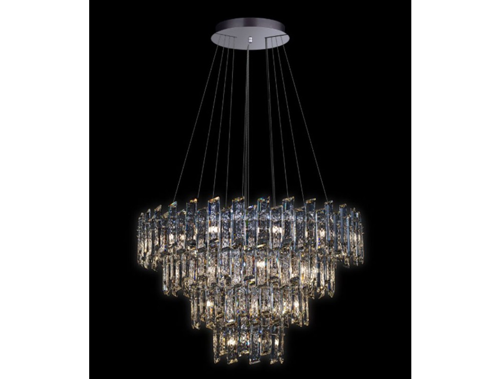Vierstufige, runde Pendelleuchte mit prächtigen K9-Kristallen und einem polierten Metallrahmen aus Gold und Chrom. Ideal zur Dekoration und Beleuchtung von Küche, Wohnzimmer, Flur und Schlafzimmer. Die Faszination der K9-Kristalle wird durch ein strukturiertes Mittelstück mit beeindruckender Größe und atemberaubender Schönheit zusätzlich hervorgehoben. Die Leuchte strahlt Luxus und Exklusivität aus. Eine prachtvolle Kaskade aus vier Ebenen mit verstellbarer Höhe.