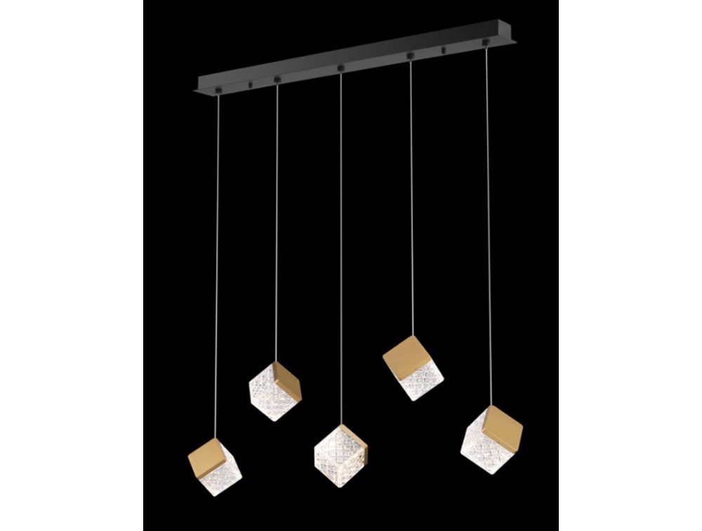 Lineare 5-flammige Pendelleuchte mit kubischem Anhänger. Erhältlich mit mattschwarzer Deckenrosette und mattgoldenem Anhänger oder mit polierter Chrom-Deckenrosette und poliertem Chrom-Anhänger. Gefertigt aus Metall mit Acrylglasdiffusor. Integrierte LED-Technologie.