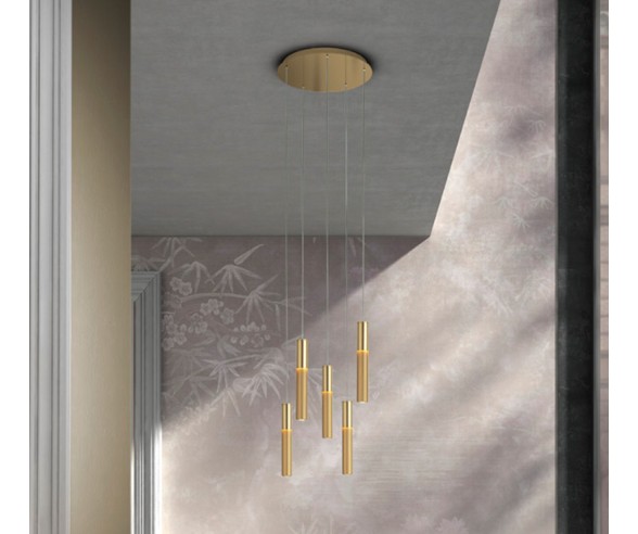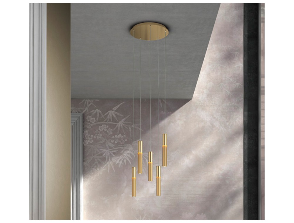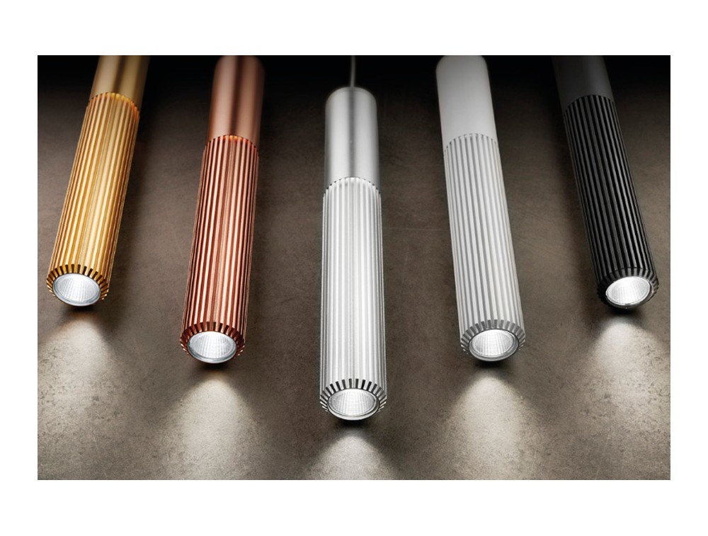 Pendelleuchte mit integrierter LED und zylindrischen Diffusoren aus eloxiertem oder lackiertem Aluminium. Direkte und seitliche Beleuchtung. Ideal für die Beleuchtung und Dekoration von Küchen, Wohn- und Schlafzimmern.
