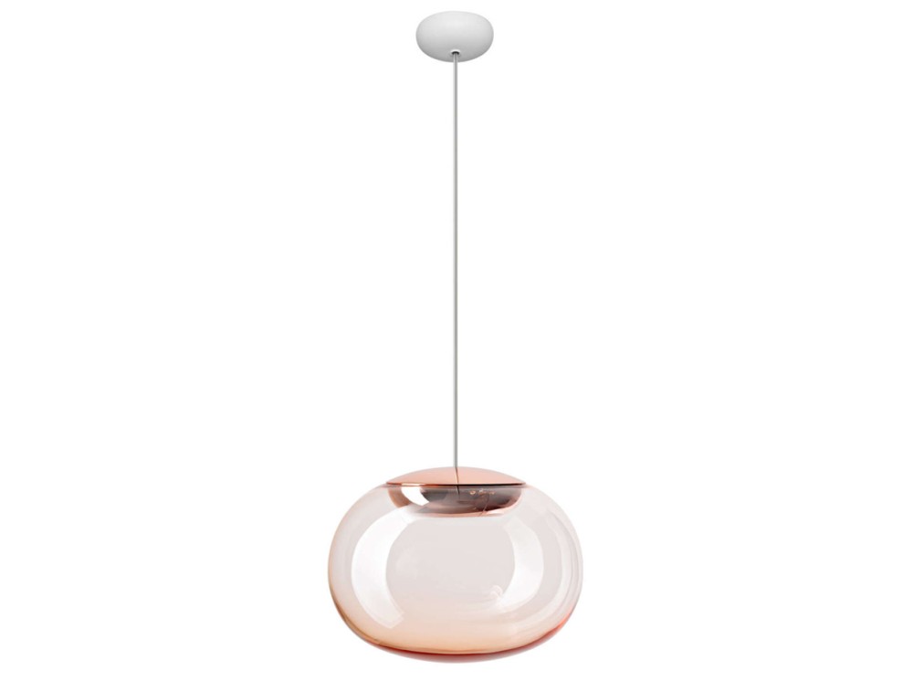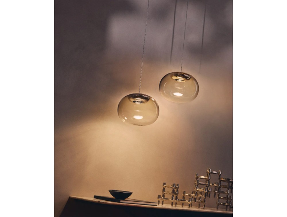 Eine mundgeblasene Glaskugel, die von innen leuchtet und ein dezentes, aber dennoch einhüllendes Licht verströmt. Das Zusammenspiel der Reflexionen auf den transparenten und metallischen Oberflächen schafft eine intime Atmosphäre und verleiht jedem Raum einen Hauch von raffinierter Eleganz. Die alte Kunst des Glasblasens trifft auf Innovation und formt einen Diffusor mit leicht ovaler Gestalt. Die LED-Lichtquelle ist unsichtbar, sodass sich das Licht gleichmäßig und blendfrei verteilt. Dieses Detail unterstreicht die pure Eleganz von La Mariée. Ihre edlen Oberflächen faszinieren. Kupfer-, Gold- und Rauchtöne verwandeln das Licht in ein warmes, lebendiges Leuchten. Ein perfektes Gleichgewicht zwischen Transparenz und Opazität, zwischen Essenz und Reflexion macht jede Leuchte zu einem Kunstwerk. Hinter ihrer scheinbaren Schlichtheit verbirgt sich die sorgfältige Erforschung von Materialien und Oberflächen. Der innere Aluminiumring und die galvanischen Verfahren betonen die Reinheit des Glases, während das transparente Tragkabel zu einem ätherischen Schwebeeffekt beiträgt. La Mariée ist die perfekte Verbindung von Technologie und Poesie.