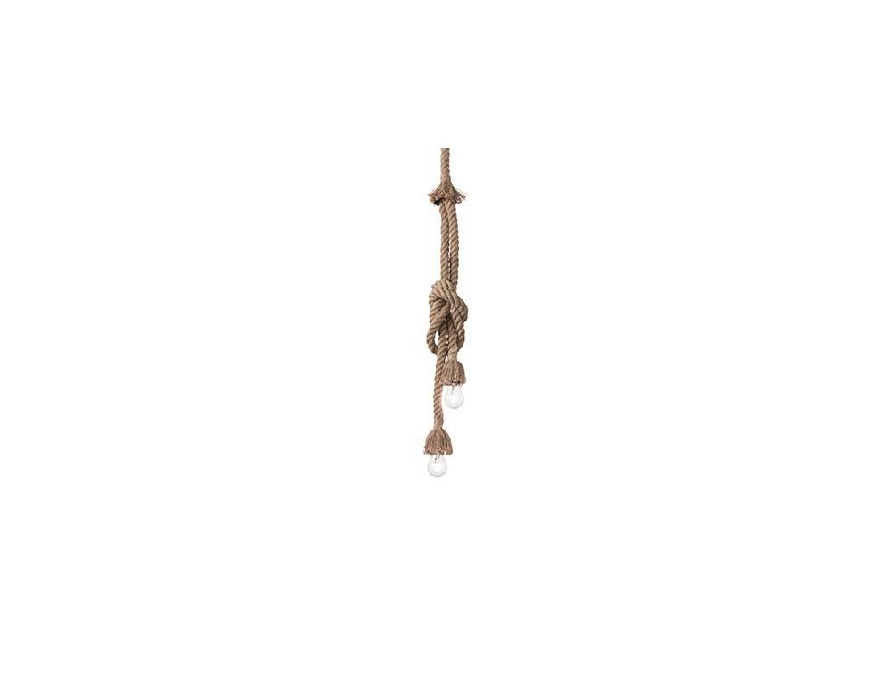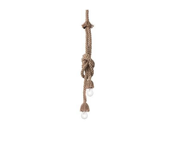 Ideal Lux-Pendelleuchte mit Metallstrukturen und elektrischen Kabeln, die vollständig mit natürlichem Hanfseil überzogen sind.