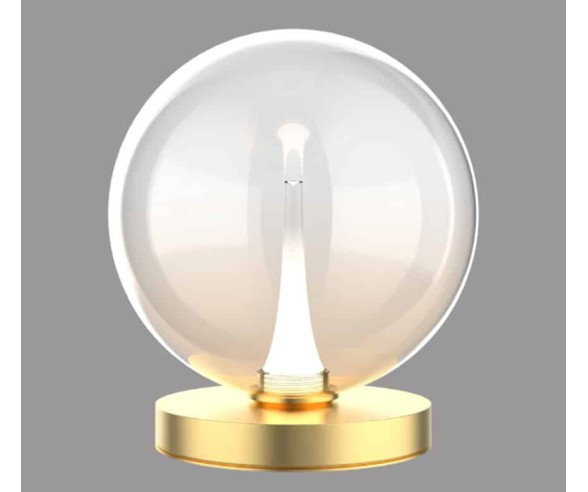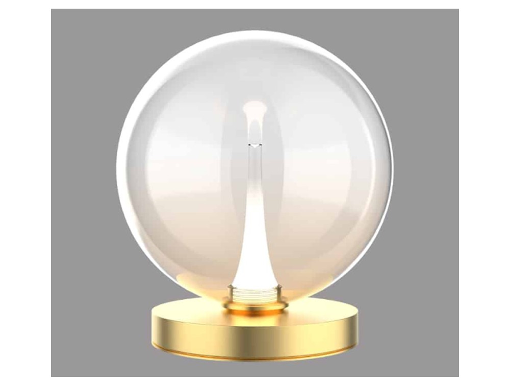 Tischlampe mit mundgeblasener Glaskugel und Metallfuß. Erhältlich in Mattschwarz mit Rauchglas oder Klarglas sowie in Satingold mit Klarglas oder Bernsteinglas. Schutzart IP20.