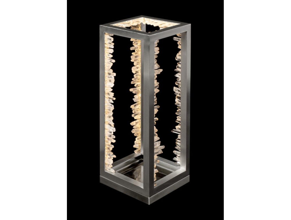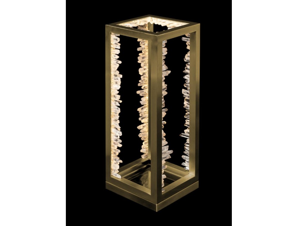 Tischlampe mit Quarz-Kristallen auf einem satinierten Metallgestell. Ideal zur Dekoration und Beleuchtung von Küchen, Wohnzimmern, Schlafzimmern und Fluren. Erhältlich in satiniertem Gold oder satiniertem Nickel.