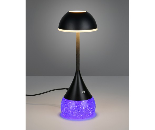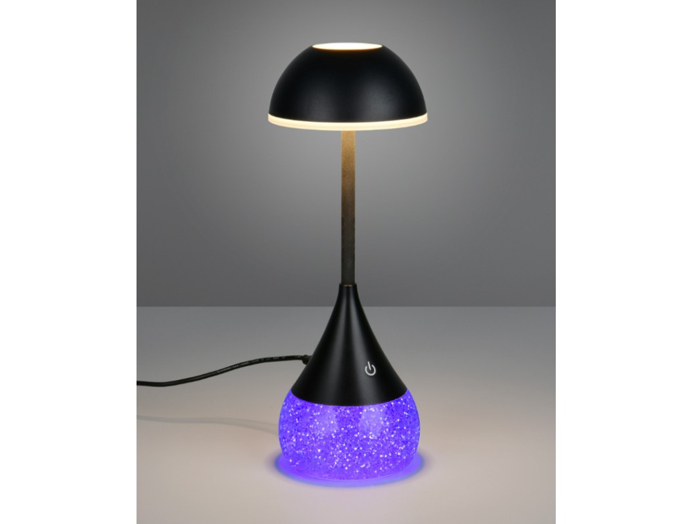 Schwarze Tischlampe aus Kunststoff mit LEDs und integrierter Dimmfunktion. Der RGB-LED-Sockel ermöglicht die individuelle Farbanpassung. Ein Berührungssensor dient zum Ein- und Ausschalten sowie zur Helligkeitsregulierung. 5 Jahre LED-Garantie und Schutzart IP20.