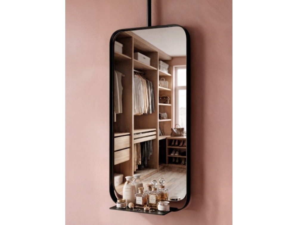 Spiegel aus Metall und Glas mit Schutzart IP20. Er ist eine innovative Einrichtungslösung, die reflektierende Funktion mit einer eleganten, minimalistischen Architektur vereint. Am unteren Rand erweitert sich der Rahmen zu einer kleinen horizontalen Ablage. Diese eignet sich ideal zur Präsentation von Wertgegenständen wie Parfümflakons, Schmuck oder Kosmetika und verwandelt den Spiegel so in eine kleine, persönliche Vitrine.
