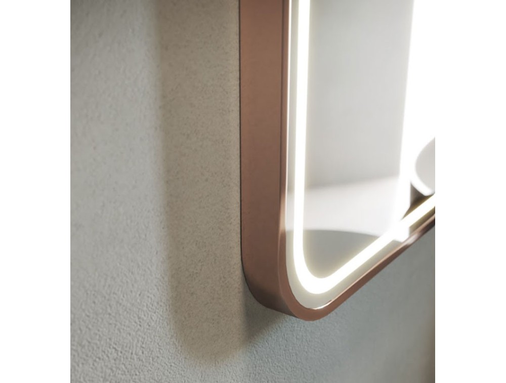 Spiegel mit Messingrahmen, abgerundeten Ecken und 10 mm starker, innen sandgestrahlter Oberfläche, LED-Hintergrundbeleuchtung. In verschiedenen Ausführungen erhältlich.
