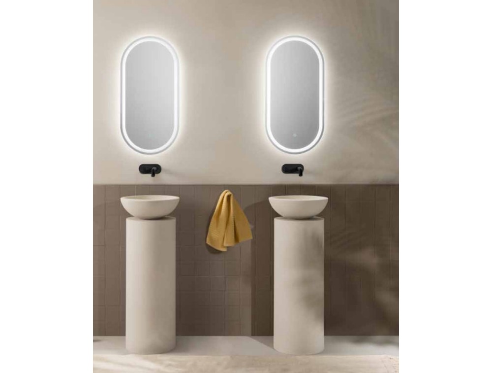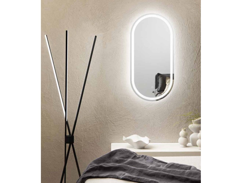 Zwei Größen, sanfte, beruhigende Linien. Die LED-Hintergrundbeleuchtung mit warmem, neutralem und kaltem Licht, per Touch-Steuerung einstellbar, hebt die Details der satinierten Kante hervor. Die Lichtquelle hat eine Lebensdauer von 30.000 Stunden. PC-Rahmen und explosionsgeschützte Folie auf der Rückseite. Satinierter, weißer Reflektor. Spiegelstärke: 4 mm. Inklusive Treiber.