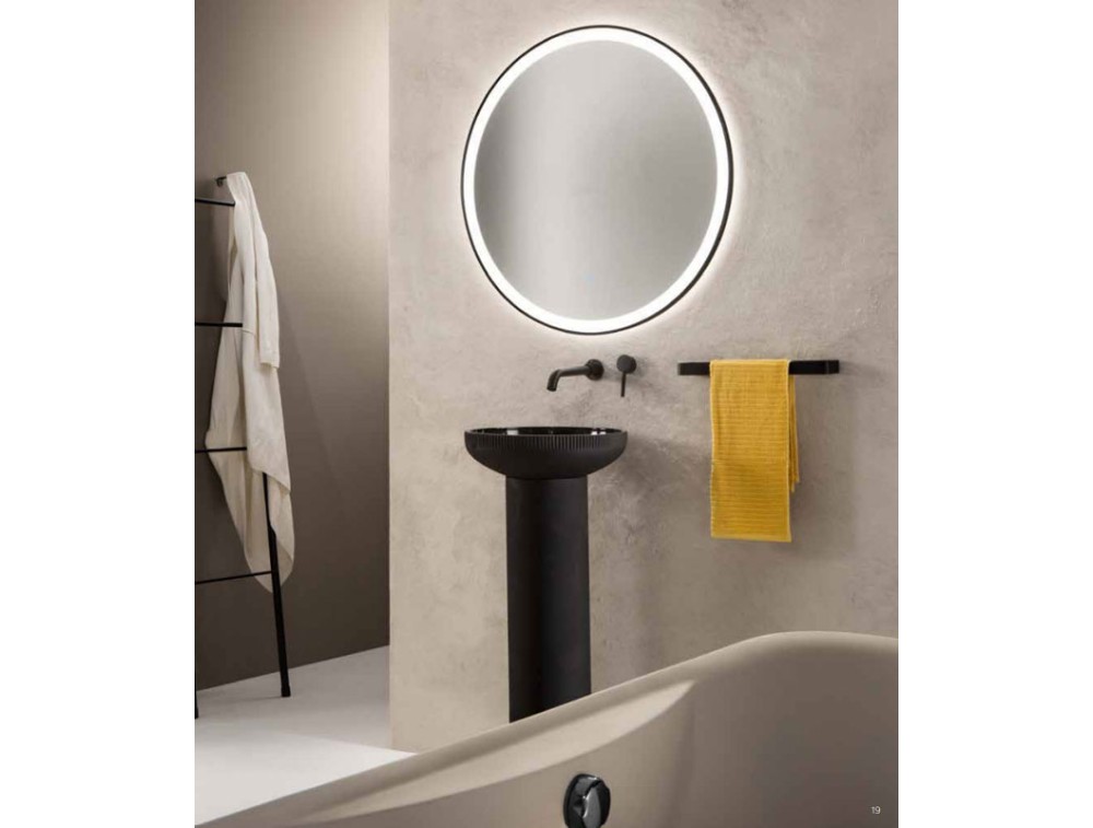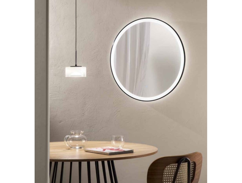 Runder Rahmen mit einem satinierten, weißen Reflektor, verziert mit einer schwarzen oder goldenen Umrandung. Die Beleuchtung erzeugt sowohl direktes als auch indirektes Licht, dessen Farbtemperatur dank der Dimmfunktion per Touch-Taste in drei Stufen eingestellt werden kann. Klare Linien und modernes Design vereinen sich in diesem runden Wandspiegel, der sich perfekt für Badezimmer oder moderne Schminkbereiche eignet. Die Hintergrundbeleuchtung wertet den Raum nicht nur optisch auf, sondern sorgt auch für eine präzise und funktionale Ausleuchtung.