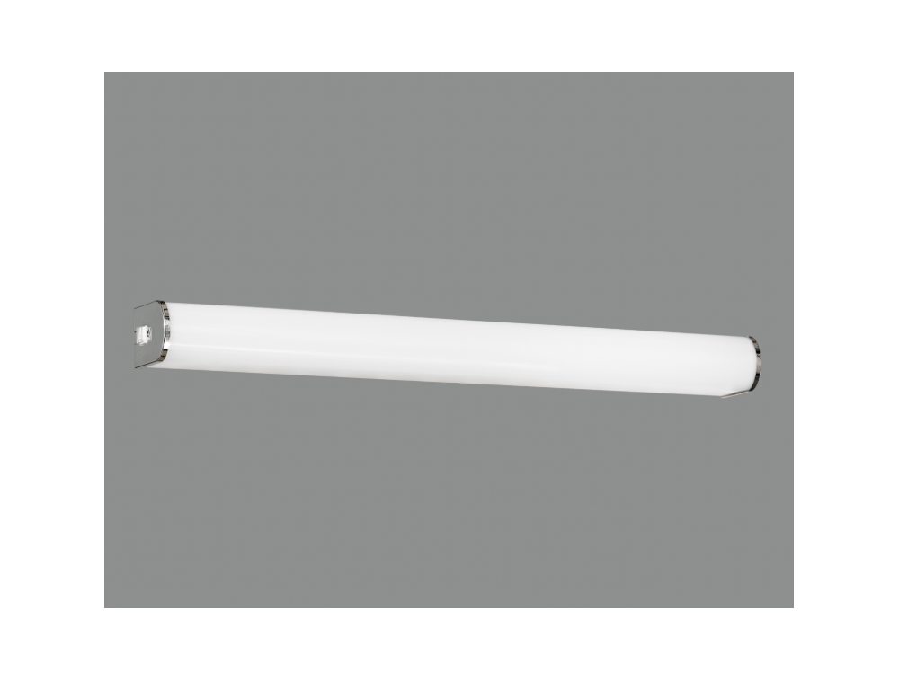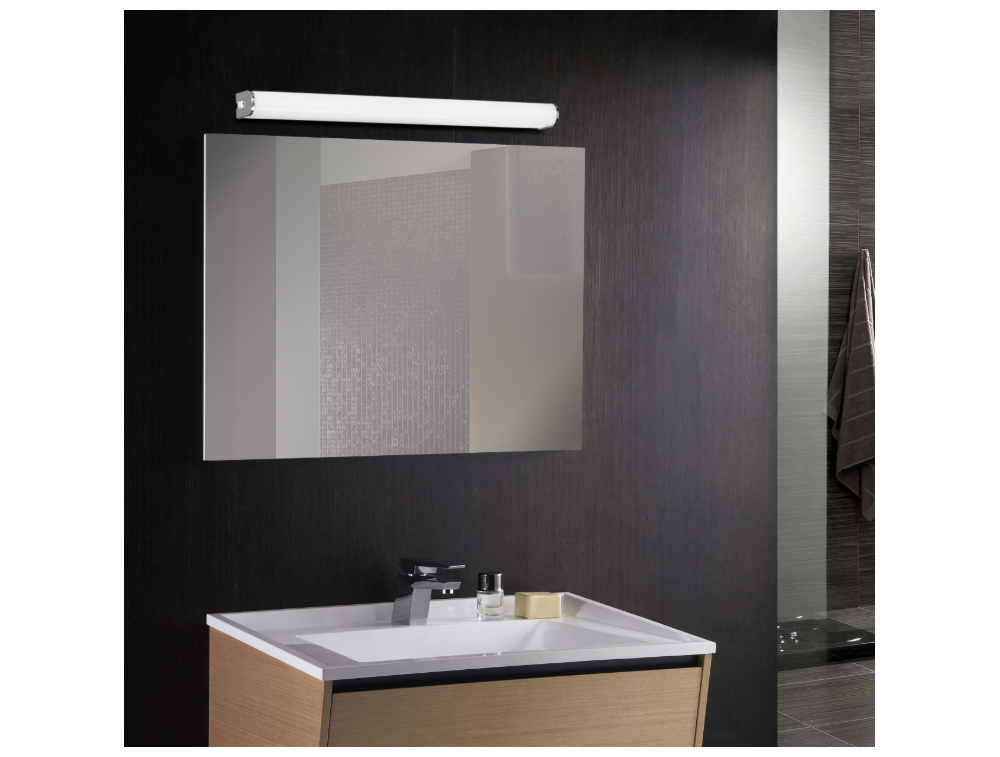 Wandleuchte aus Aluminium mit Polycarbonat-Diffusor und integrierter, dimmbarer LED. Schutzart IP44 (spritzwassergeschützt). Das opalweiße Gehäuse sorgt für gleichmäßiges, diffuses Licht und verhindert harte Schatten im Gesicht bei der Spiegelbenutzung. Wie in der Abbildung dargestellt, ist die Länge optimal, um einen Großteil der Breite eines Standardspiegels auszuleuchten und so eine vollständige Lichtverteilung zu gewährleisten.