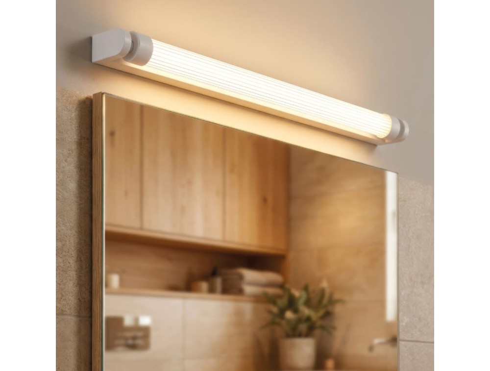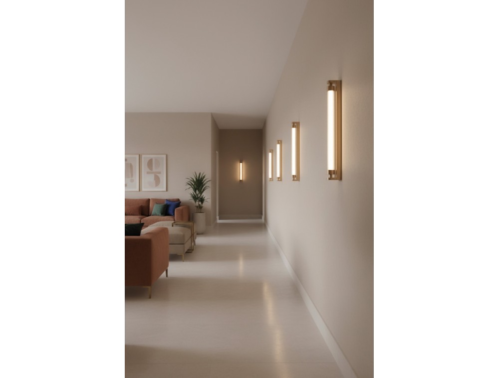 Wandleuchte aus Metall mit Acrylglasdiffusor und integrierter, dimmbarer LED. Erhältlich in Weiß, Gold und Schwarz. Schutzart IP44. Die Leuchte vereint industrielles Minimalismus und luxuriöse Eleganz und eignet sich ideal zur Beleuchtung von Spiegeln oder Wänden in exklusiven Badezimmern. In Kombination mit anderen Leuchten sorgt sie für eine hervorragende Ausleuchtung des Gesichts. Sie harmoniert perfekt mit natürlichen Materialien wie Marmor oder dunklen, strukturierten Oberflächen, auf denen die Messingakzente besonders gut zur Geltung kommen. Die gebürstete Goldoberfläche passt ideal zu passenden Armaturen und schafft so ein harmonisches Gesamtbild mit eindrucksvoller Wirkung.
