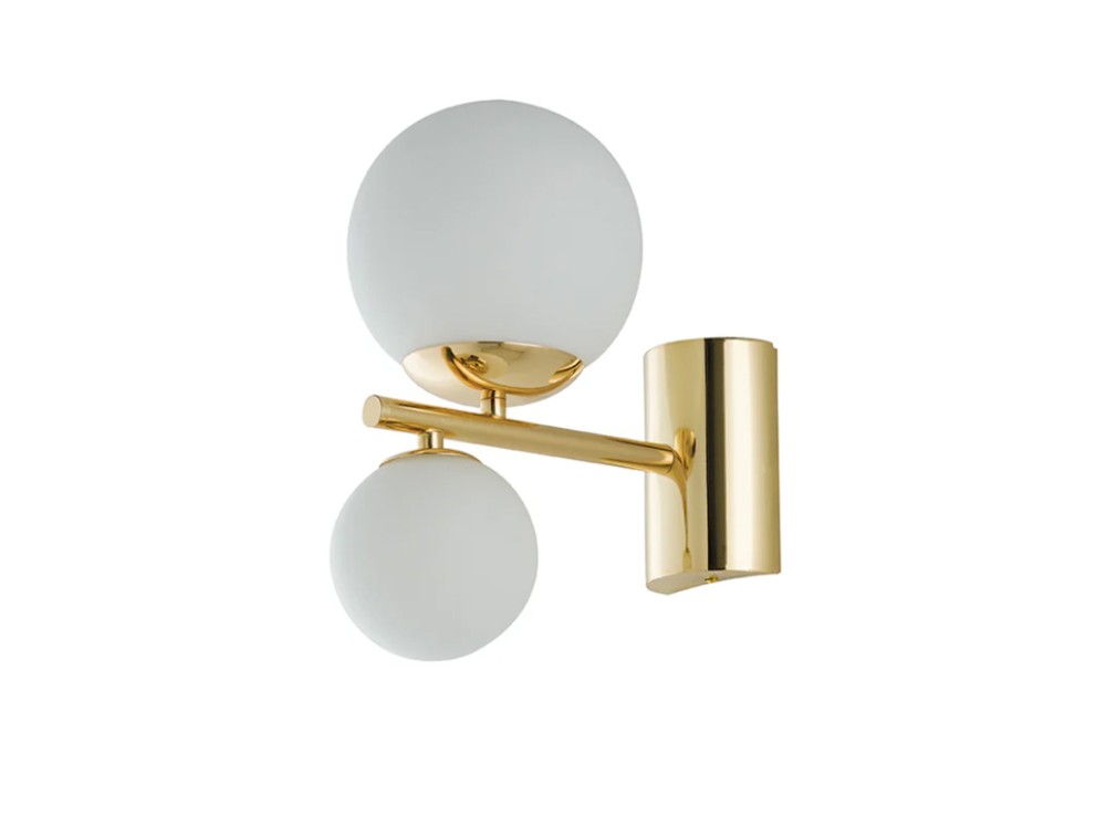 Goldfarbene Wandleuchte aus Metall mit Diffusoren aus mundgeblasenem Opalglas. Ideal für Küchen, Wohnzimmer und Schlafzimmer.