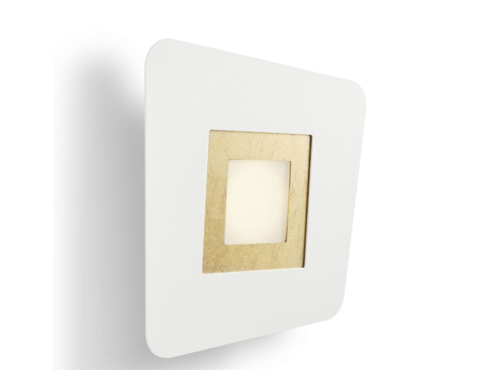 Wandleuchte mit weißem oder anthrazitfarbenem Metallrahmen und austauschbaren Elementen in Blattgold, Blattsilber, Blattkupfer und Stahl. Sie kann auch als Deckenleuchte montiert werden. Dank ihrer flachen, klaren Form eignet sie sich perfekt für Räume mit niedrigen Decken oder für Flure und Durchgänge, wo ein wuchtiger Kronleuchter stören würde. Mit ihren Blattgold- oder Blattsilberelementen ist sie auch eine stilvolle und zugleich dezente Ergänzung für Wohn- oder Schlafzimmer.