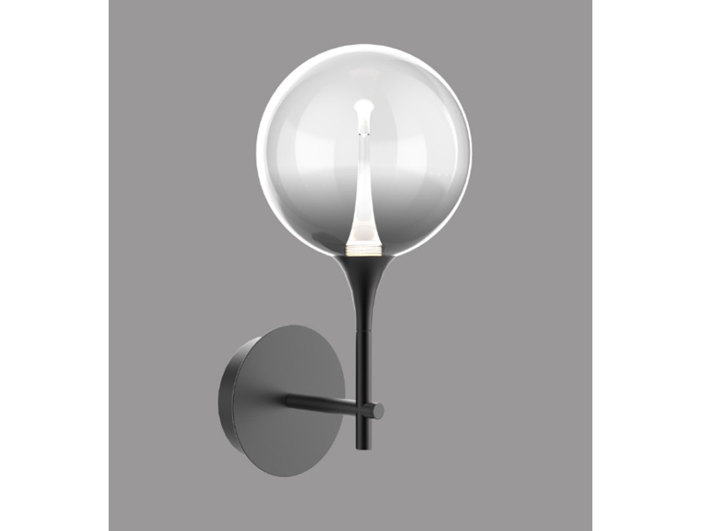Wandleuchte mit mundgeblasener Glaskugel und Metallsockel. Erhältlich in Mattschwarz mit Rauchglas oder Klarglas sowie in Satingold mit Klarglas oder Bernsteinglas. Schutzart IP20.