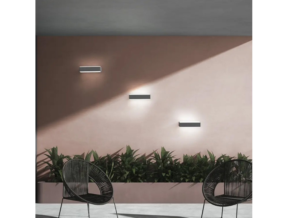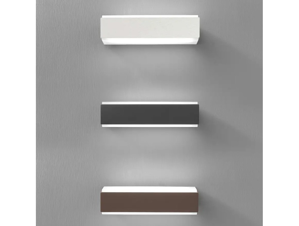Außenwandleuchte mit integrierter LED, lackiertem Aluminiumdruckgussrahmen, Diffusor aus Methacrylat, zweistrahlig. Für Gärten, Wege, Balkone und jeden Außenbereich.