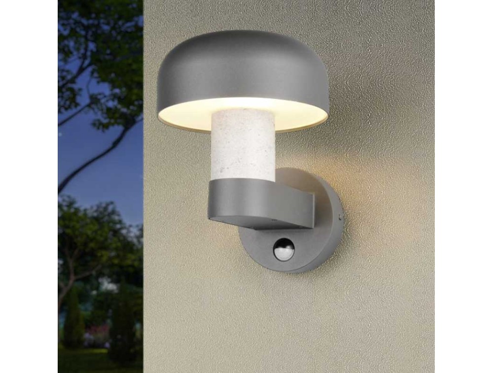 Außenwandleuchte aus Aluminiumdruckguss, erhältlich in Holz/Anthrazit oder Beton/Anthrazit. Wahlweise mit oder ohne Bewegungsmelder. Schutzart IP54, insbesondere gegen Staub und Spritzwasser.