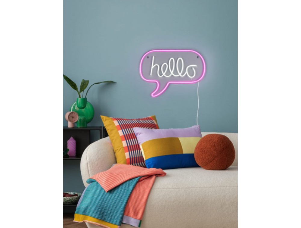 Wandleuchte aus Kunststoff mit dem Schriftzug „Hello“, ideal für Küchen, Wohnzimmer, Schlafzimmer, Flure und Gewerberäume. Ausgestattet mit einem Schnurschalter und 5 Jahren LED-Garantie. Schutzart IP20.