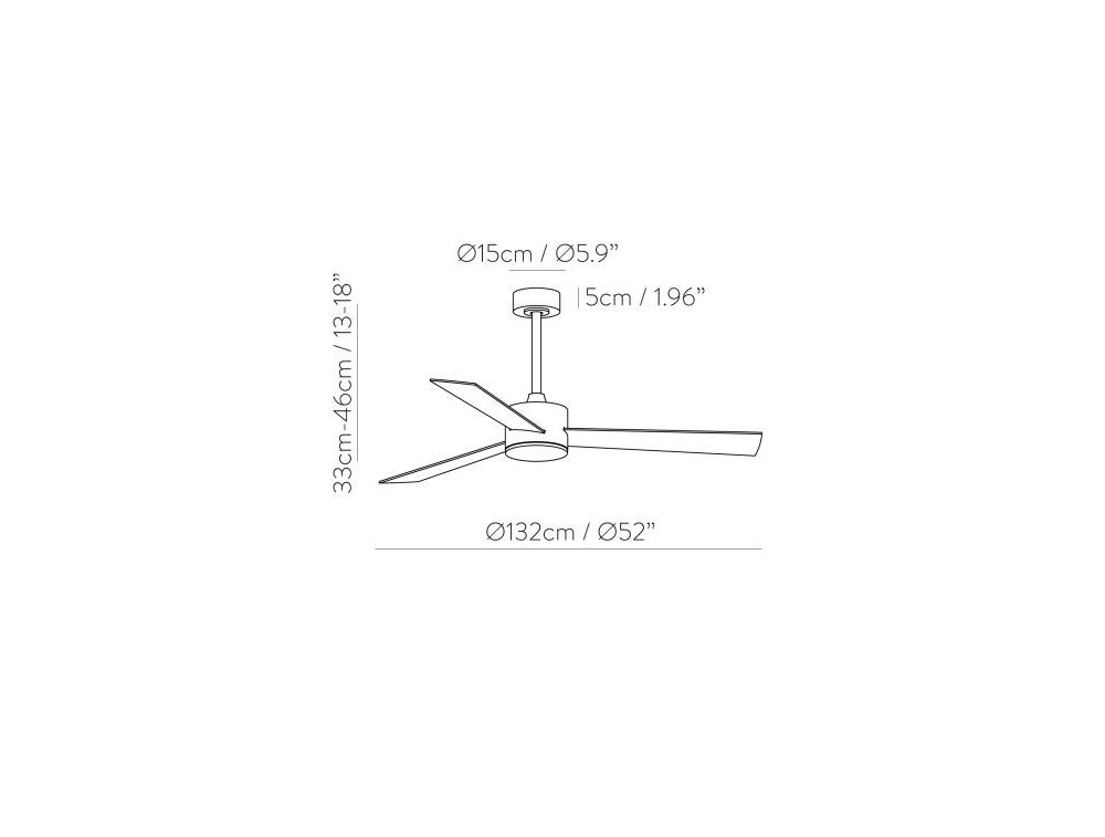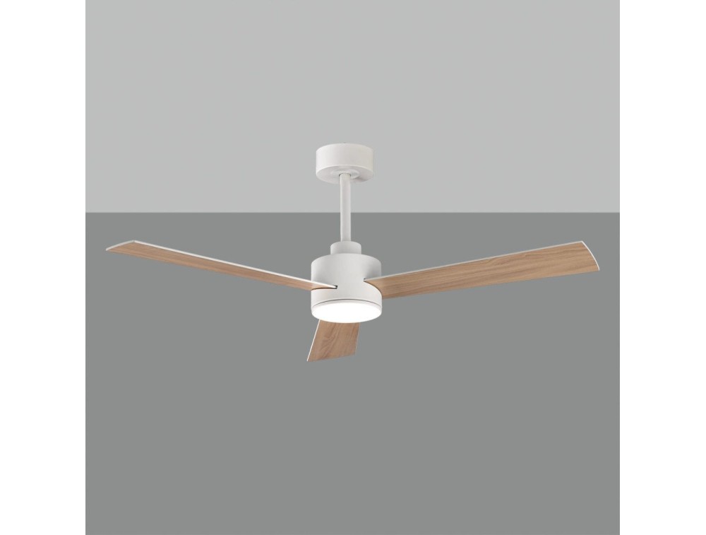 Fan with reversible blades. Silent fan lamp designed for living rooms and kitchens. White color with three reversible blades in white or beech wood effect. Remote control* to control the fan and lighting functions. Includes two installation posts and is suitable for sloped ceilings.
