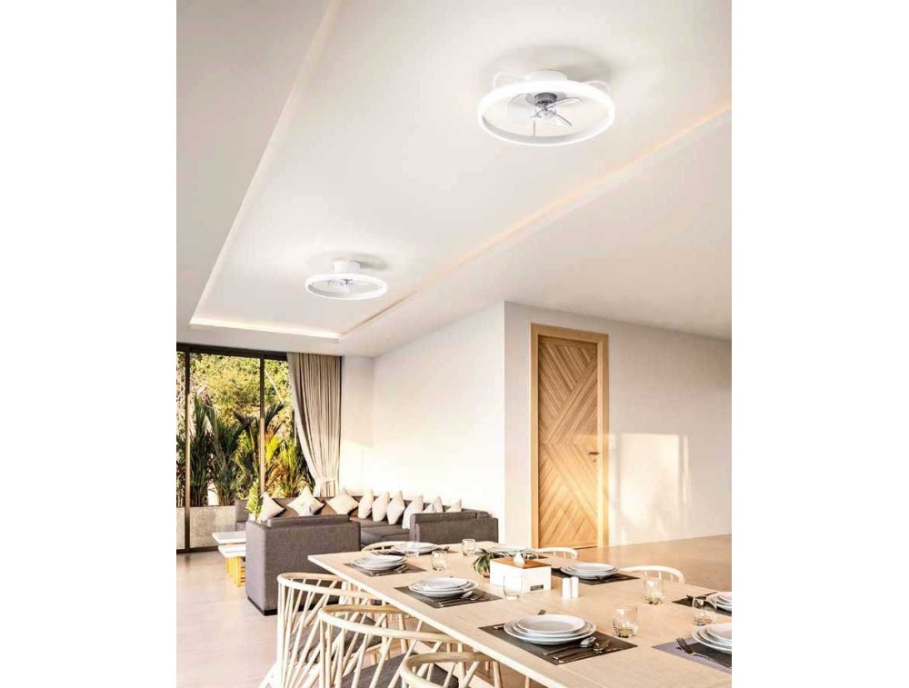 Ceiling fan composed of a metal structure and polycarbonate diffuser. The fan also has the light function, which is wired with LEDs. The lamp is made up of a K-SWITCH 3000-4000K system
