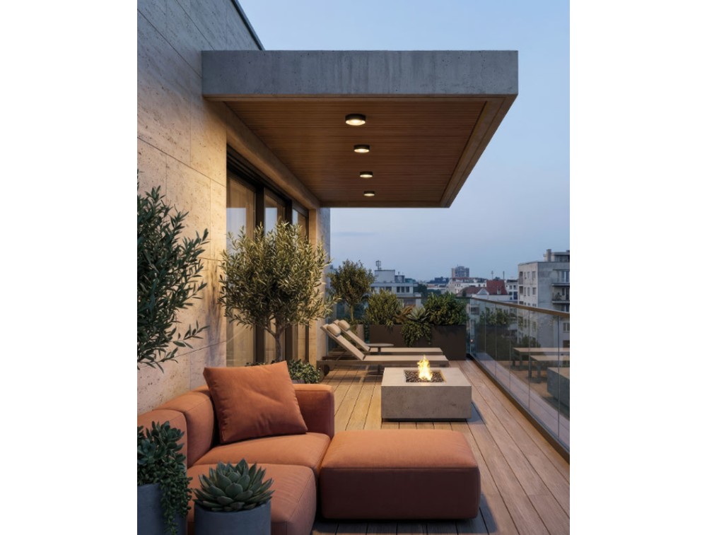 Aluminum and acrylic ceiling light with integrated LED and IP65 protection against humidity, corrosion, and splashes of water. Ideal for modern spaces requiring discreet and unobtrusive accent lighting. For porches, verandas, entrances, balconies, terraces, gardens, and any outdoor space. Installed in series along a covered path, it creates a striking rhythmic effect of light and shadow. Thanks to its compact shape, it is perfect for small terraces where space is limited but a distinctive light is desired.
