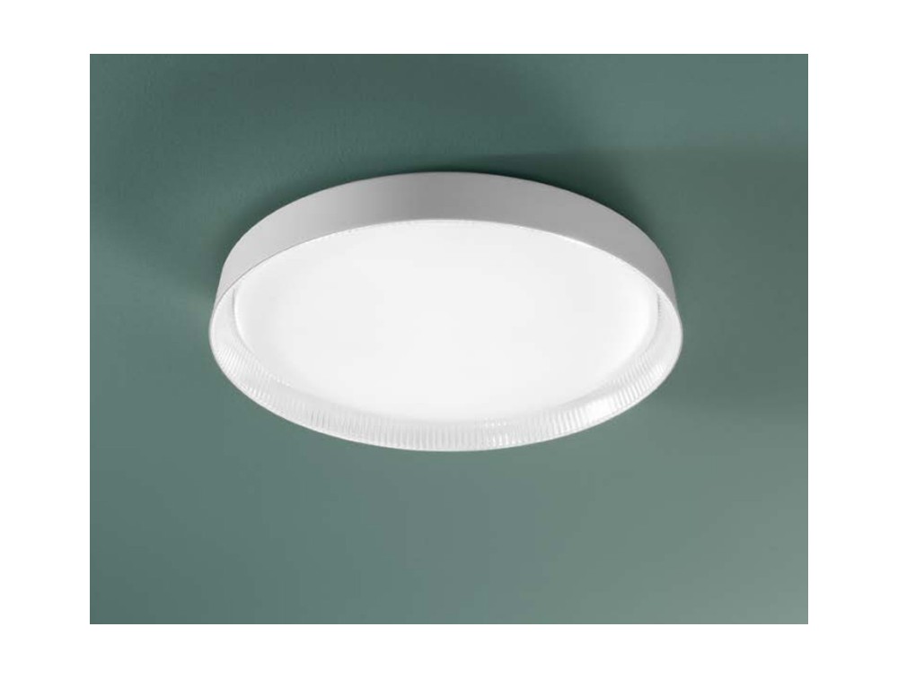 The Kaos ceiling lamp is made of white plastic fibers. Perfect for bathrooms, it features a diamond-cut inner edge, while a satin white acrylic diffuser completes the elegant design. The color temperature adjustment system, via an internal switch, offers customizable lighting.