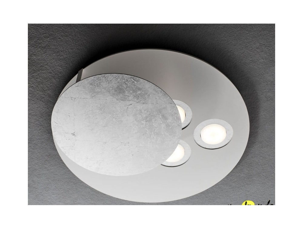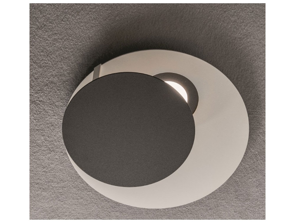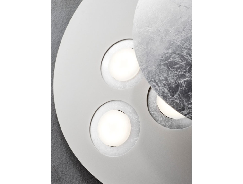 Designed to provide direct, semi-direct, or indirect light, simply by rotating the small disc on its axis to cover or uncover the bulbs. You can then decide on the light you want on the spot. The metal frame is white, and the bulb discs coordinate with the movable disc. Available in various colors, including black, white, gray, sand, gold leaf, silver leaf, copper leaf, and steel. Thanks to its modern yet refined style, it is perfect for an elegant living room, dining room, or bedroom where you want a designer piece that also serves as a decorative element.