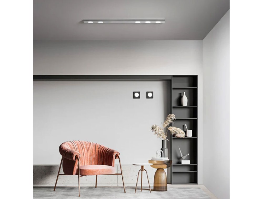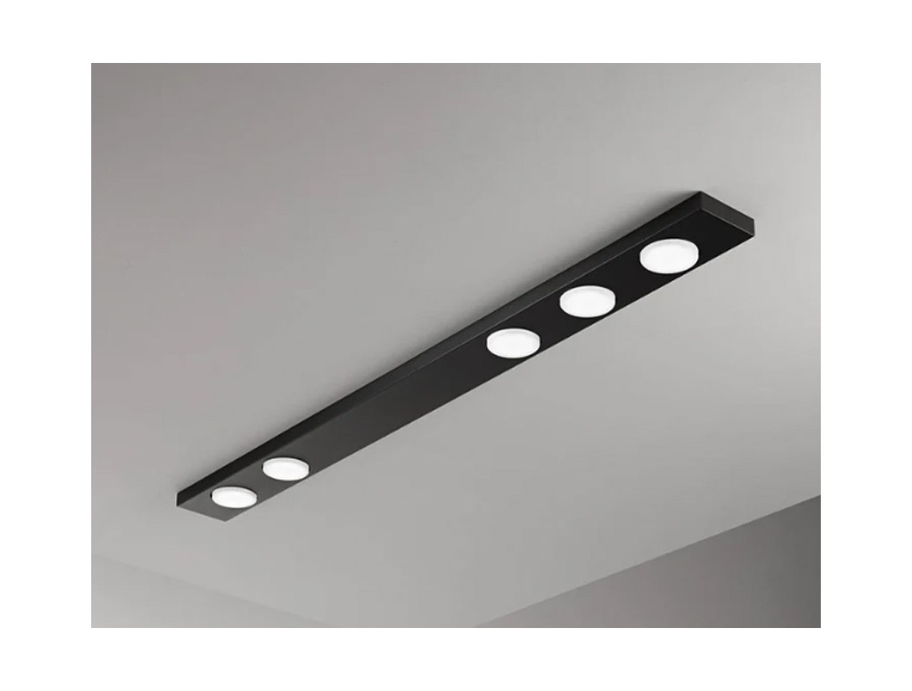 Ceiling lamp with 1, 3, or 5 lights, featuring a metal base that houses GX53 bulbs, ensuring effective and uniform lighting. Available in various finishes, including aluminum, white, and black. It is perfectly suited to technical or transit areas, such as studies, offices, corridors, or bedrooms. The large 120cm version is intended exclusively for use as a ceiling light.