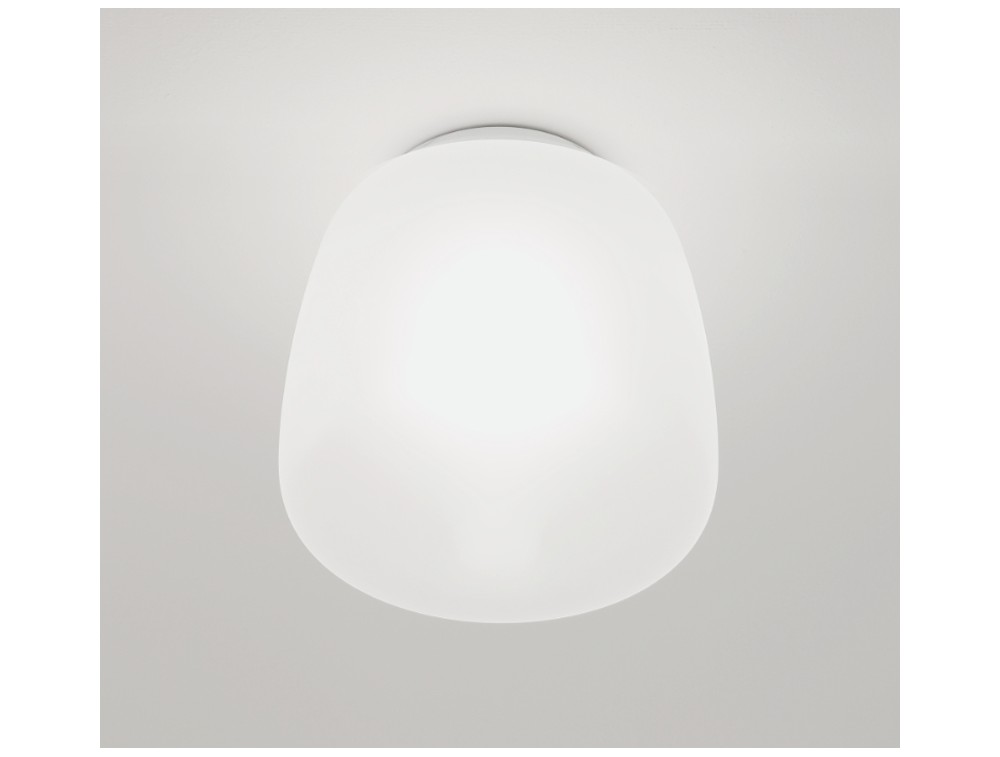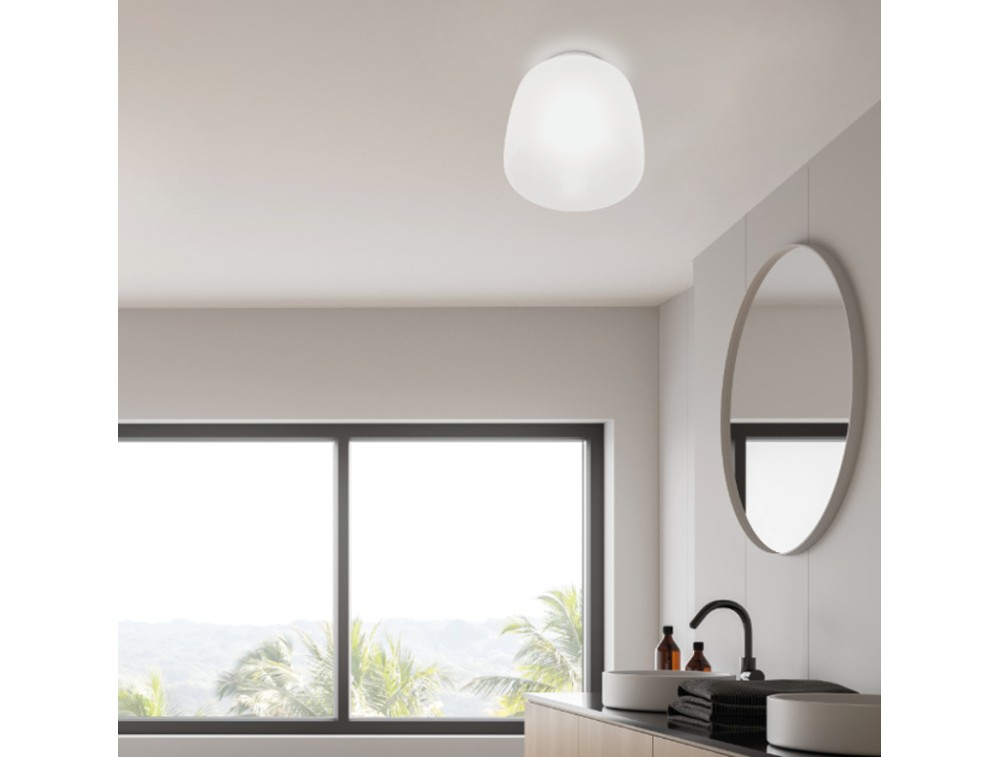 Ceiling lamp with an aluminum body in a white soft-touch finish and a white frosted glass diffuser. It features a contemporary-minimalist design with a revisited "Space Age" feel. It's very clean, almost abstract. It looks great in pastel-colored spaces, Scandinavian-style homes, or bright, modern offices.