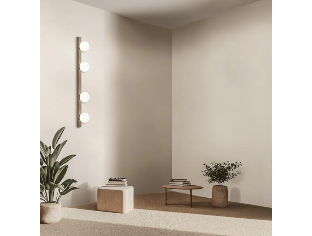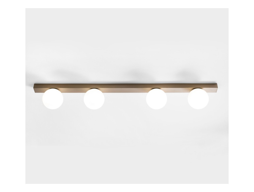 Ceiling lamp with 4 lights and an iron body with glass diffusers. Available in various finishes, including anthracite and sand. It can also be used as a wall sconce. It embodies a minimalist and contemporary style, focusing on clean geometry and the contrast between rigid lines and soft shapes. Thanks to the opal glass, the light is emitted uniformly 360 degrees around each sphere, avoiding direct glare and creating a soft atmosphere.