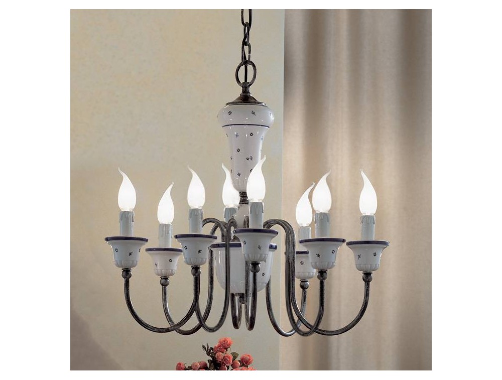 Rustic design chandelier with 8 lights made with hand decorated ceramic diffuser with metal structure. Lamp with a strong rustic style that can be placed in any room of the same design style. Its colorful ceramic details give the lamp a further touch of refinement and elegance. The decorations are purely for illustrative purposes, it is in fact possible to customize them according to the tastes and needs of the customer.