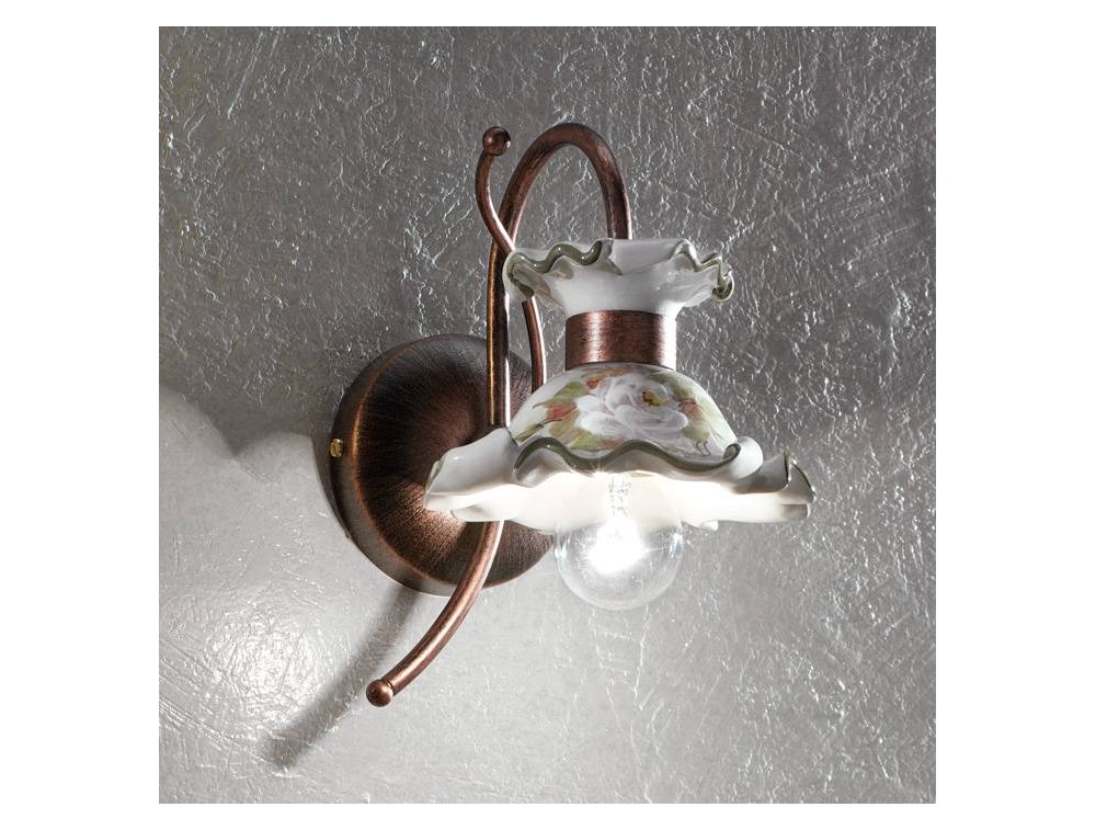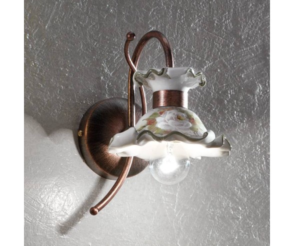 Wall lamp with a rustic design made of polished ceramic, hand decorated with floral details and brass structure. Lamp diffuser with undulating and jagged edges, perfect for enhancing a rustic environment, brass structure. The ferroluce lamps offer a wide choice in the decorations, which are completely handmade, detail through which you can request customization.