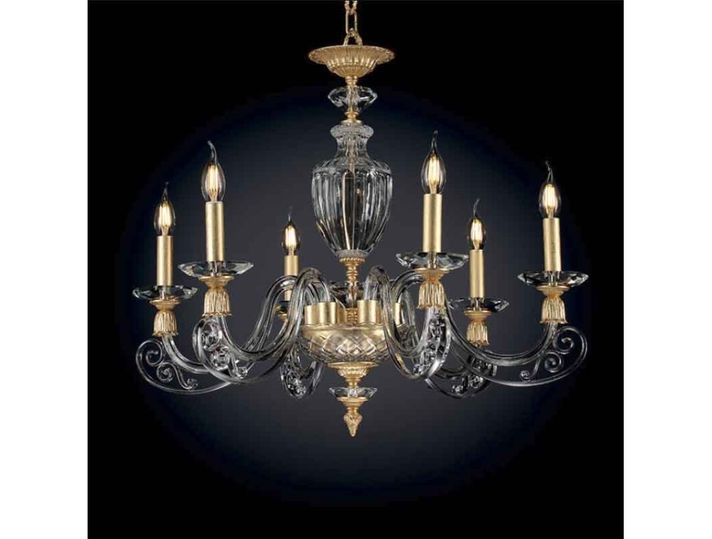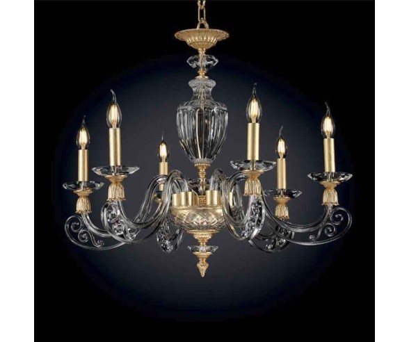 The chandelier of the Otello collection made by Ciciriello is made of metal in two chromatic finishes: pure crystal and total black. The uniqueness of the lamp is given by the details in handmade gold leaf. Details that do not leave the lamp unnoticed. With a classic and refined style, this chandelier is ideal in elegant environments and with the same style as the lobby of hotels, living areas and entrances. A product Made in Italy.