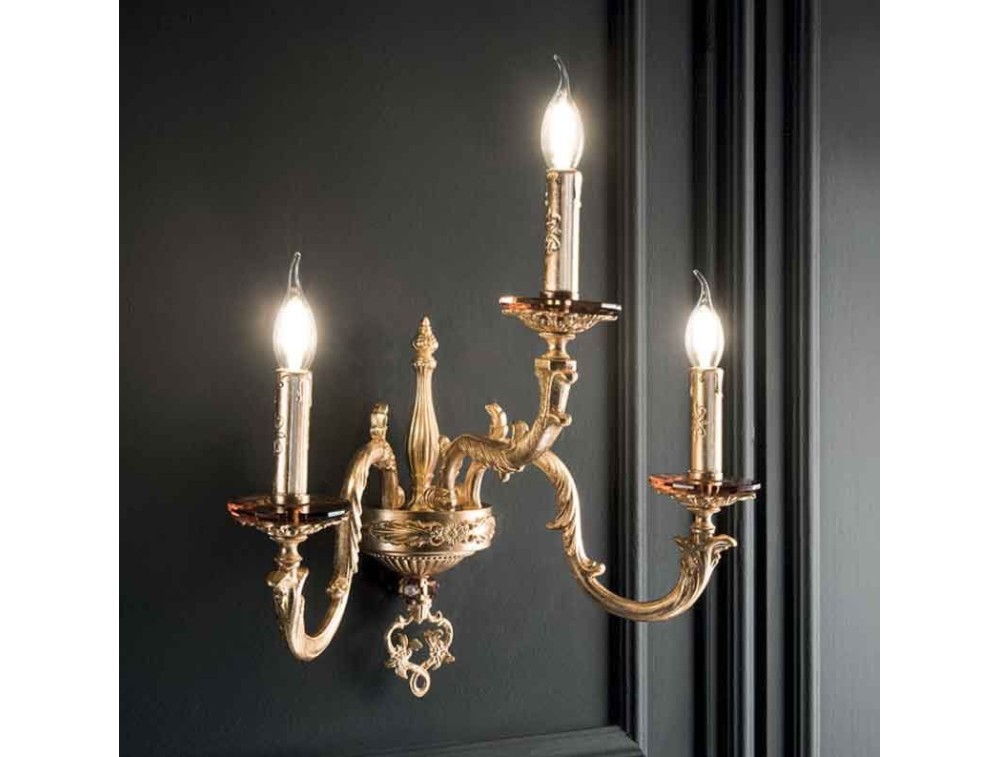 The wall lamp of the Klimt collection made by Ciciriello is made of brass decorated by hand with gold leaf. It is available in several very rich finishes, including: transparent crystal, ruby, black and amber. A precious chandelier to be placed in classic style environments such as bedrooms, living areas and dining rooms. Its details make it unique and certainly will not make it go unnoticed. A made in Italy product which in addition to lighting, furnishes in a functional way the room in which it is placed.