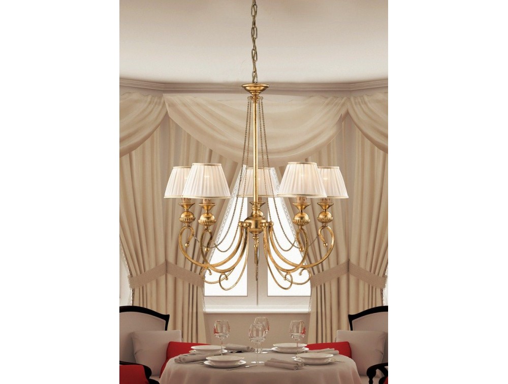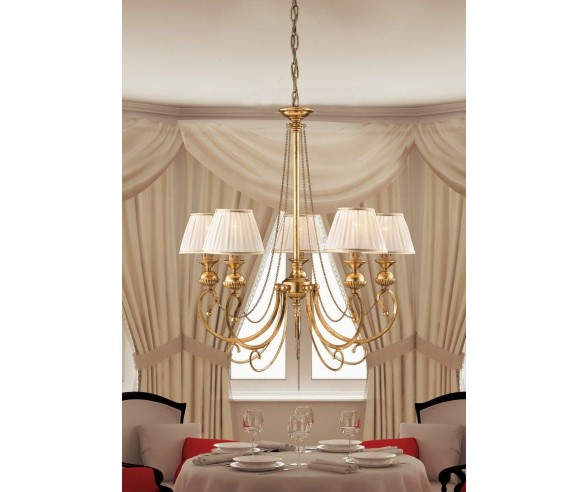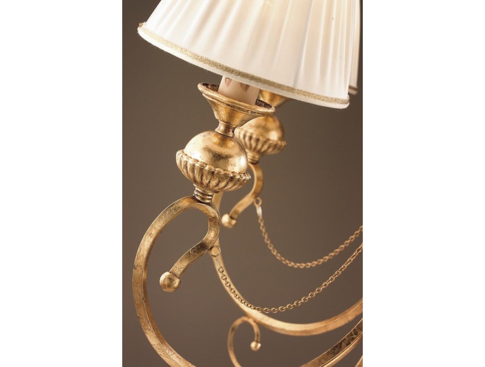 Grazioso lighting, chandelier made of wrought iron structure in gold finish and lampshade in fabric with gold colored cord.