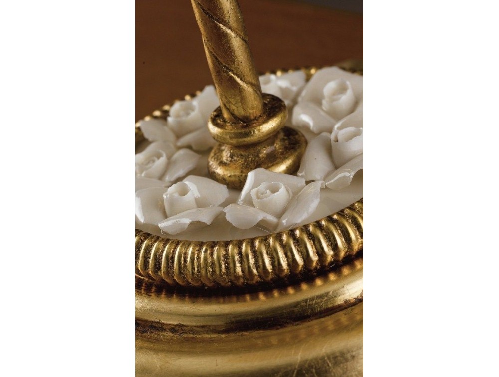 Table lamp of classic design made of wrought iron structure in gold leaf finish and white glossy porcelain, lampshade in fabric with gold colored cord. Lamp with an elegant and refined design thanks to the details that enrich the structure like the ceramic roses and the double finish banded lampshade. Ideal lamp in rooms of the same style of furniture as living rooms, living rooms, living areas and bedrooms.