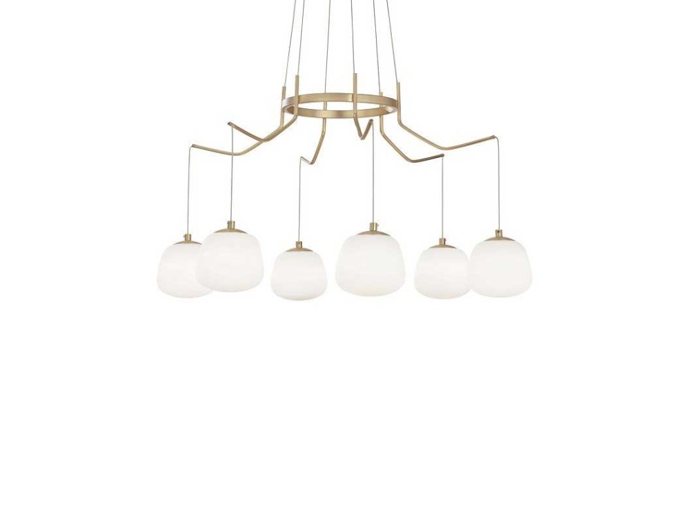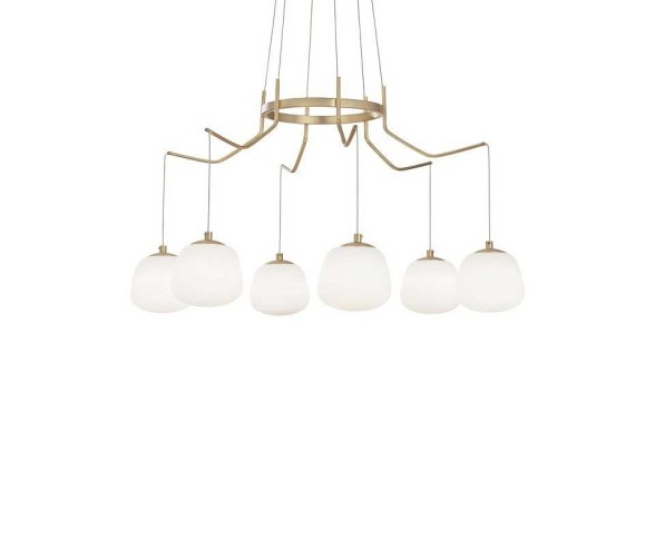 Suspension Karousel has a metal frame finished in satin brass. White cased glass diffusers.