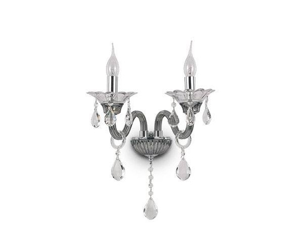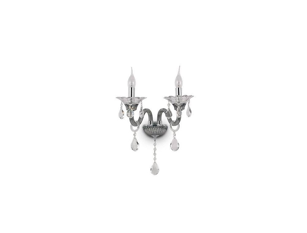 Ideallux illuminazione, applique da parete dal design contemporaneo con montatura e dettagli in metallo cromato, bracci in vetro soffiato. Pendagli ed elementi decorativi in vetro trasparente e cristallo molato.