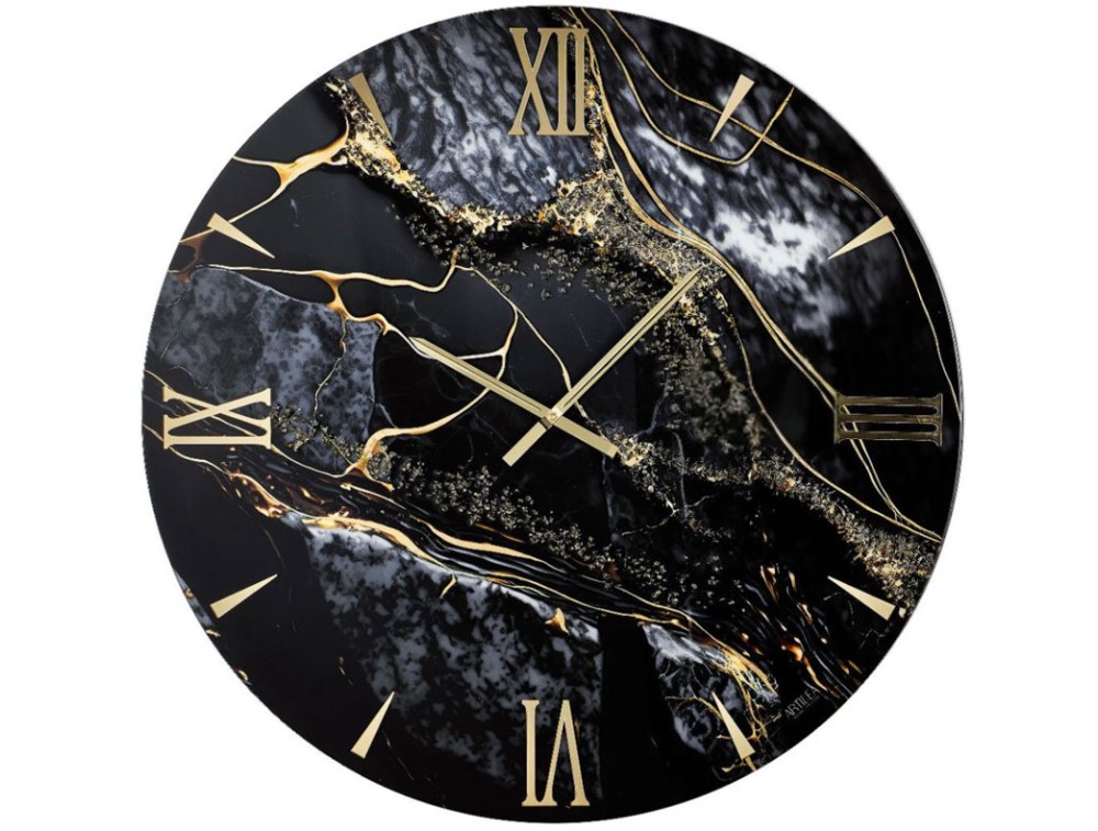This clock is designed and hand-decorated in Italy with fine finishes. The wooden base is coated with UV-resistant epoxy resin, enhancing a decoration inspired by the energy of volcanic surfaces. The gold grain and tone-on-tone crystals blend elegantly against the black background, creating a deep, textured visual effect. The gold-mirrored plexiglass Roman numerals and gold-plated metal hands add brightness and refinement. Equipped with a Contini Firenze movement.
