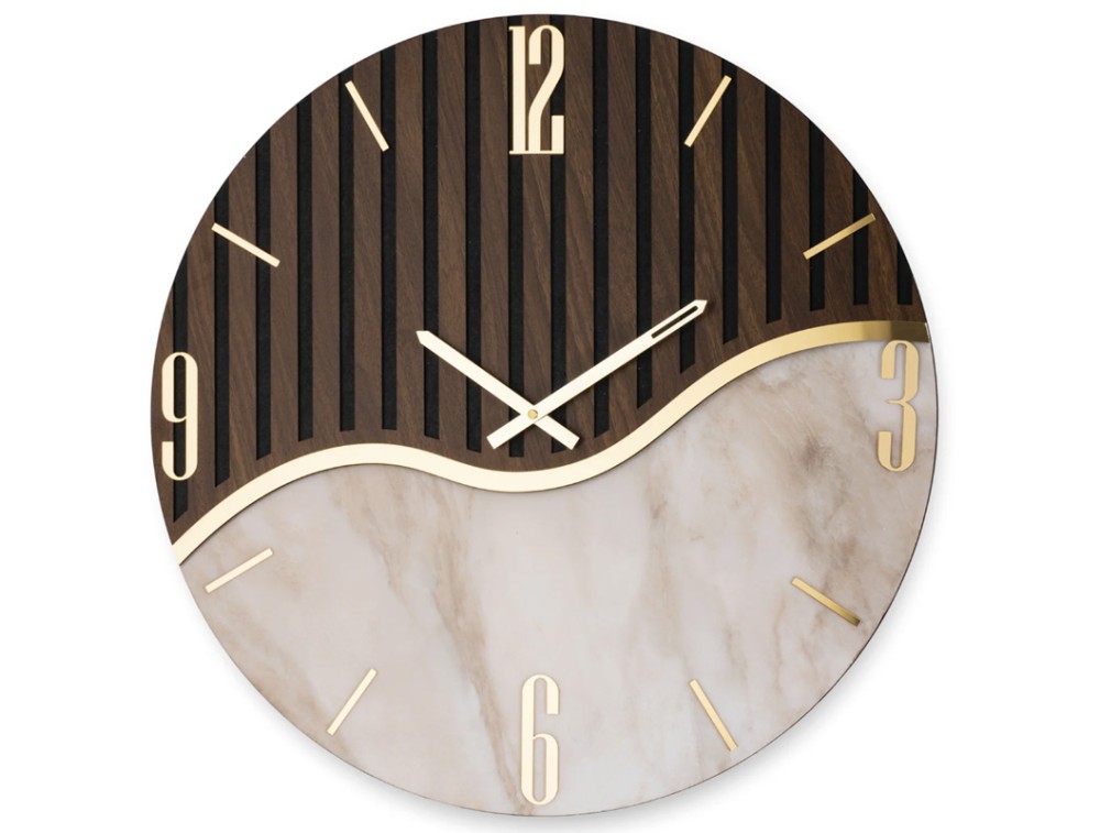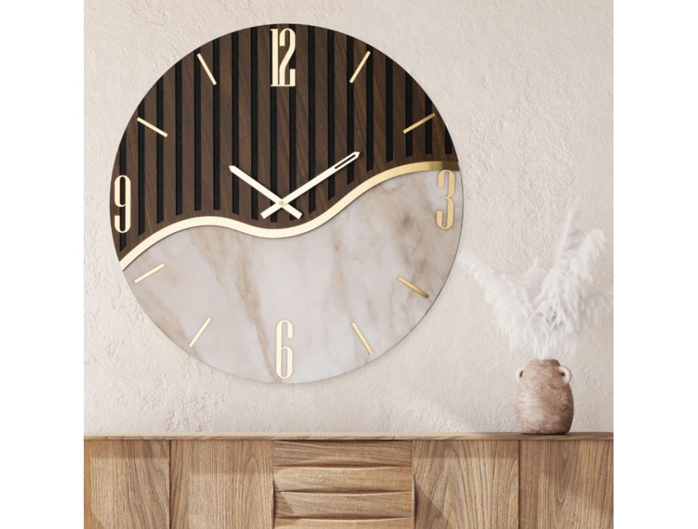 Elegant circular ribbed wood clock, enriched with unique details. High-quality marble-grain print on the side, polished hands, mirrored plexiglass numbers, and a movement made in Italy. Suitable for kitchens, entryways, studies, living rooms, and bedrooms.