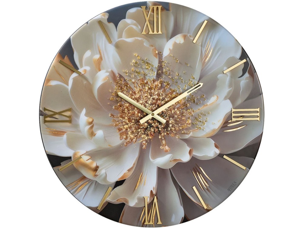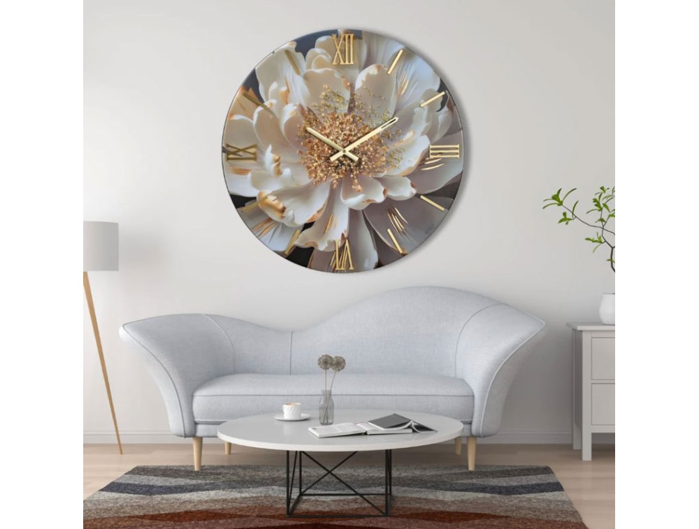 A stunning wall clock, a floral explosion in a neutral yet luxurious palette. It pairs well with Elegant Neutral, Glamorous, and Minimalist decor styles, where the contrast between the simplicity of the room and the opulence of the dial creates a sophisticated effect. Free shipping and a 2-year warranty.