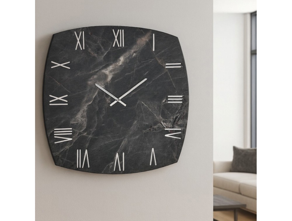 A striking decorative choice, ideal for elegantly completing your living room or lounge. The glossy black marble-effect resin surface is enhanced by natural veining that enhances its visual depth. The slightly rounded square shape lends a modern touch, while the mirrored plexiglass Roman numerals and polished metal hands add brightness and style. Entirely made in Italy, with meticulous craftsmanship, it can be mounted to the wall with two anchors. Shipping is free and the warranty is 2 years.