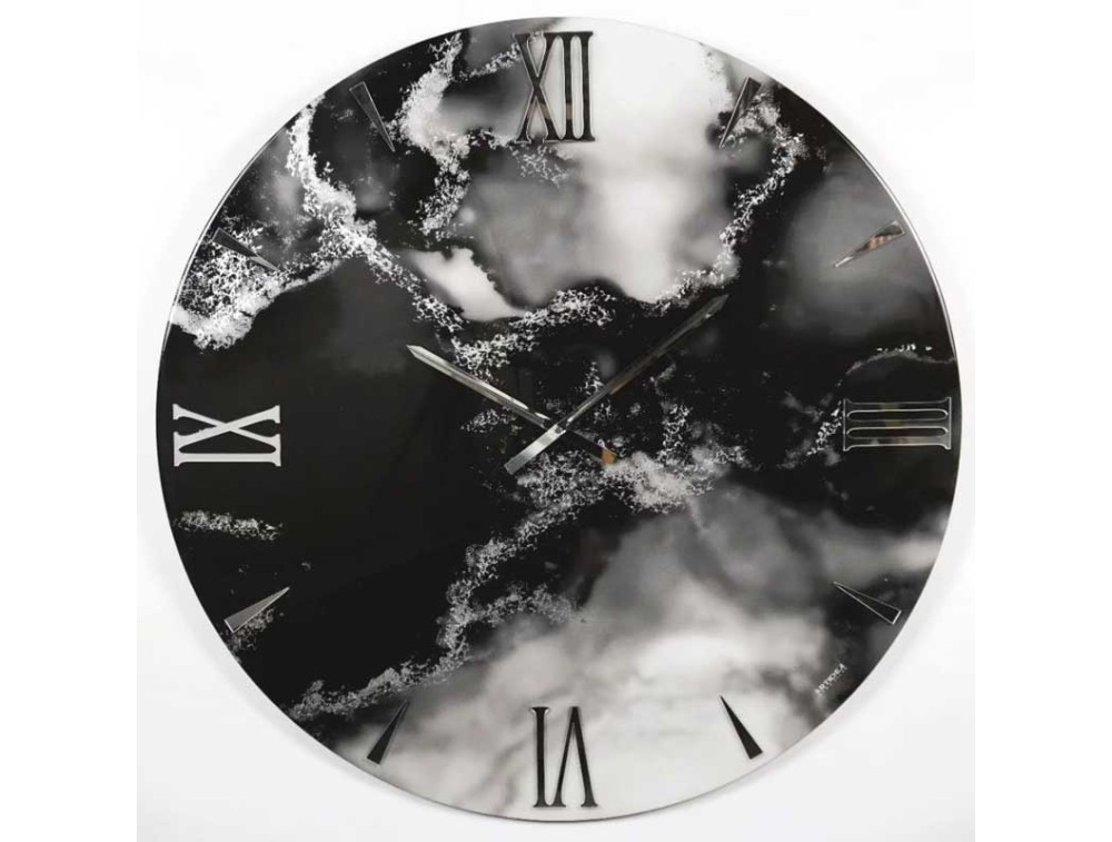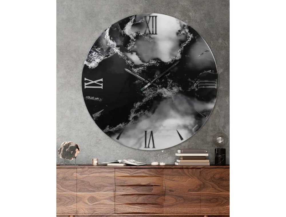 Entirely hand-decorated in Italy with fine materials and craftsmanship. The wooden base is coated in epoxy resin with intense black and white contrasts, inspired by the movement of smoke, embellished with elegant hand-applied silver leaf inserts. The surface is UV-resistant, ensuring brilliance and durability. The aesthetic is completed by silver mirrored plexiglass Roman numerals and silver-chromed metal hands, for a sophisticated and bold visual effect.